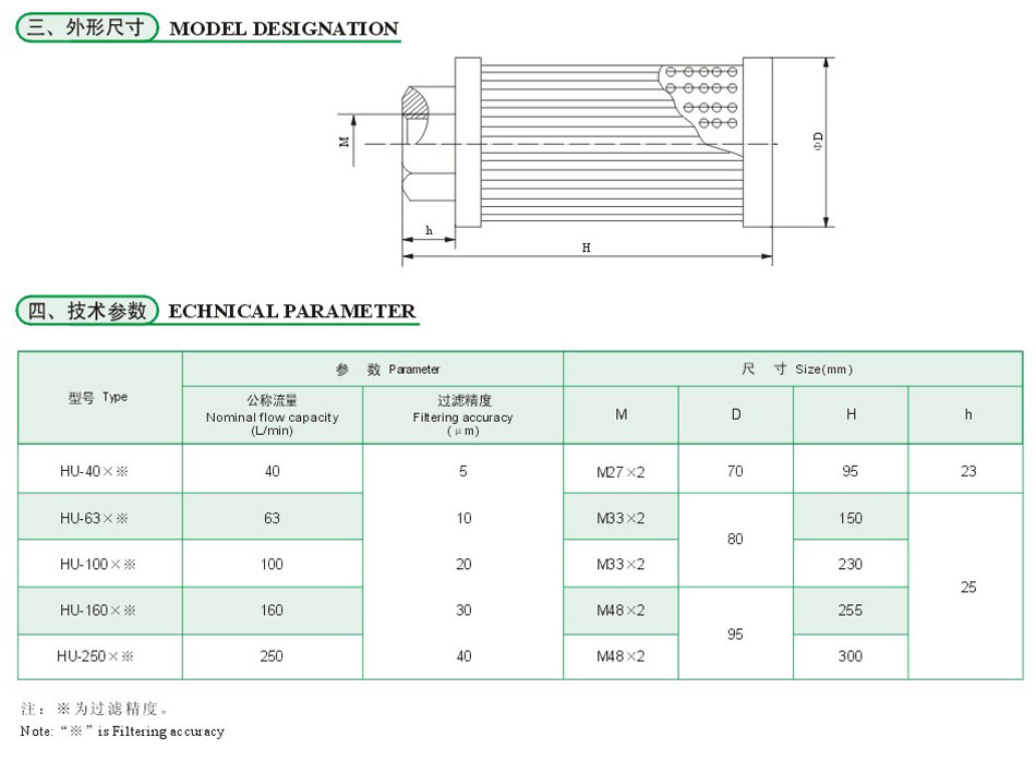 HU回油過濾器直接與回油管路螺紋連接,伸入油箱的油液中,結構簡單,使用安裝簡便。濾芯采用新型化纖濾材,具有通油能力大,過濾精度高,壓力損失小,納污量大等優點。